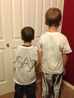 After we all ate and enjoyed chatting with each other, I noticed Carter and Brax were wearing different under shirts than I had put them in to come tonight. I was shocked and confused. (I mean who would be messing with the boys' clothes?) I asked Jake what they were wearing, and he looked at my sister and said, "Ready Ju?" So then Brax and Carter came over to me and took off their button up shirts to show me what was underneath them. They were shirts that asked me to Marry Jake.
